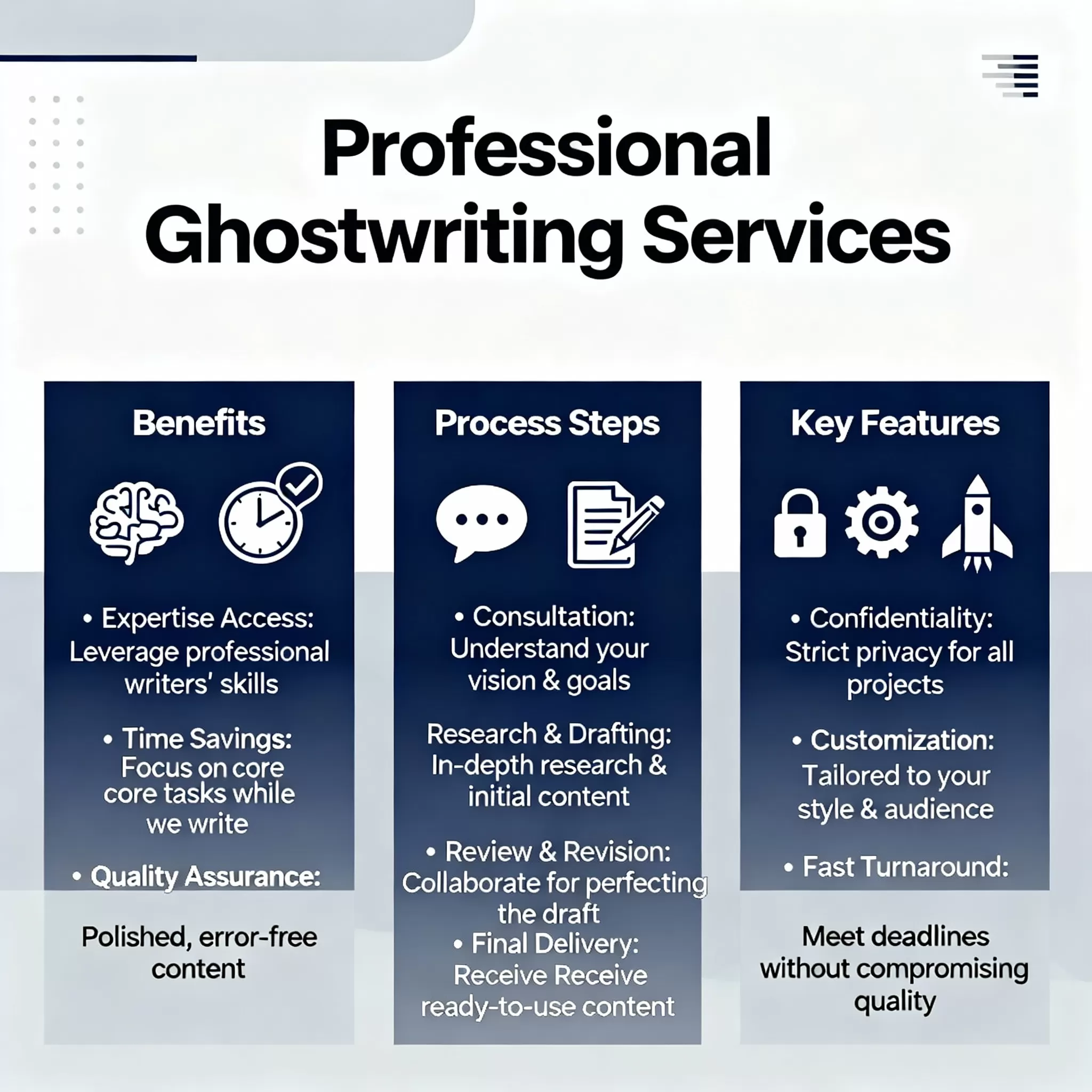 Time efficiency is crucial in today's fast-paced world. Our ghostwriting services free you from the writing burden, allowing you to focus on other priorities while ensuring your content meets the highest standards. Every piece undergoes thorough research, careful crafting, and meticulous editing.